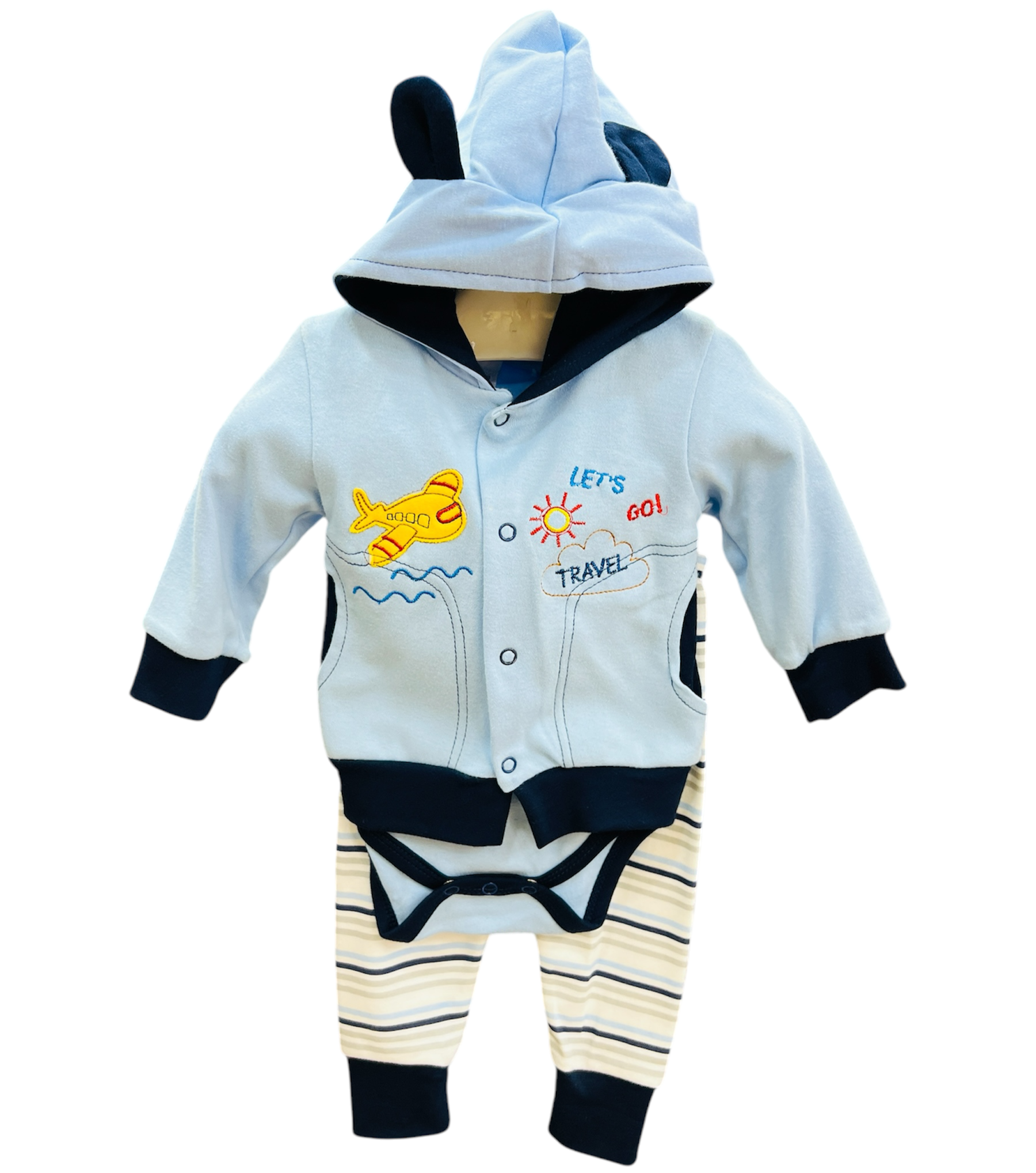 This 3-piece blue hooded suit for infants is perfect for keeping your little one warm and comfortable. Made from soft, durable material, it provides maximum comfort and style. The hooded design adds an extra layer of warmth, while the 3-piece set offers convenience and versatility. Ideal for any baby wardrobe, this suit is a must-have for every parent.