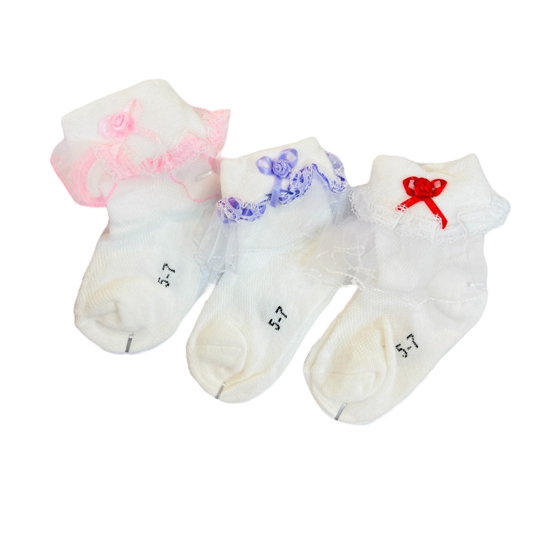 These baby socks are a cute and stylish addition to your little one's outfit. With frill details and bows in various colors, they are sure to make a statement. Made with soft and comfortable materials, these socks are perfect for keeping little feet warm.