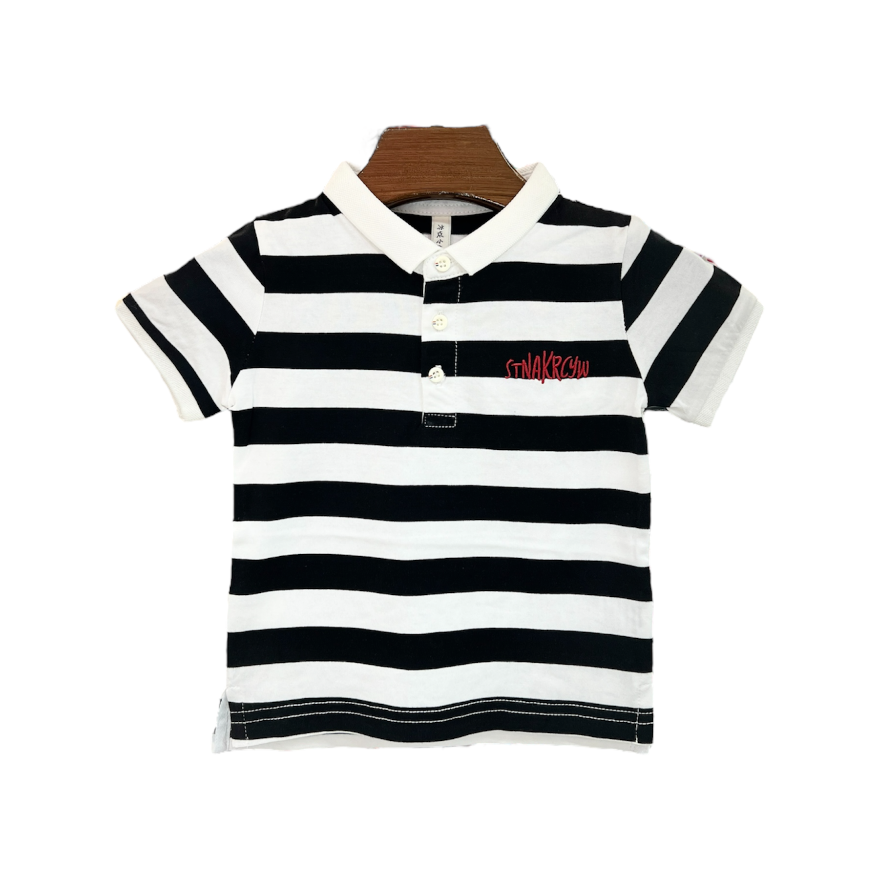 Introducing our Black Stripes Polo T-Shirt for baby boys. Made with high-quality material, this shirt features a sleek black stripes design that will keep your little one looking stylish and comfortable. Perfect for any occasion, it's a must-have addition to any baby boy's wardrobe. Upgrade your little man's style today!