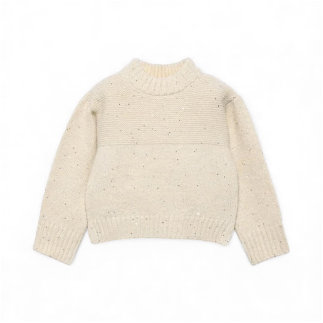 The Golden Sequence Sweater is a cozy and stylish addition to any baby girl's wardrobe. Made with high-quality woollen material, this sweater will keep your little one warm while also adding a touch of glamour with its golden sequins. Perfect for colder months, this sweater is a must-have for any fashion-forward infant.