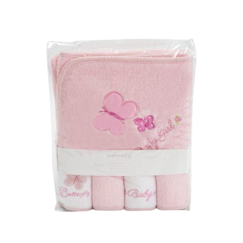 Upgrade your child's bath time with our Hooded Bath Towel & Face Towels Set. Made with soft, absorbent material in a pretty pink color and adorned with a butterfly theme, this set not only keeps your child warm and cozy, but also adds a touch of fun to their daily routine.