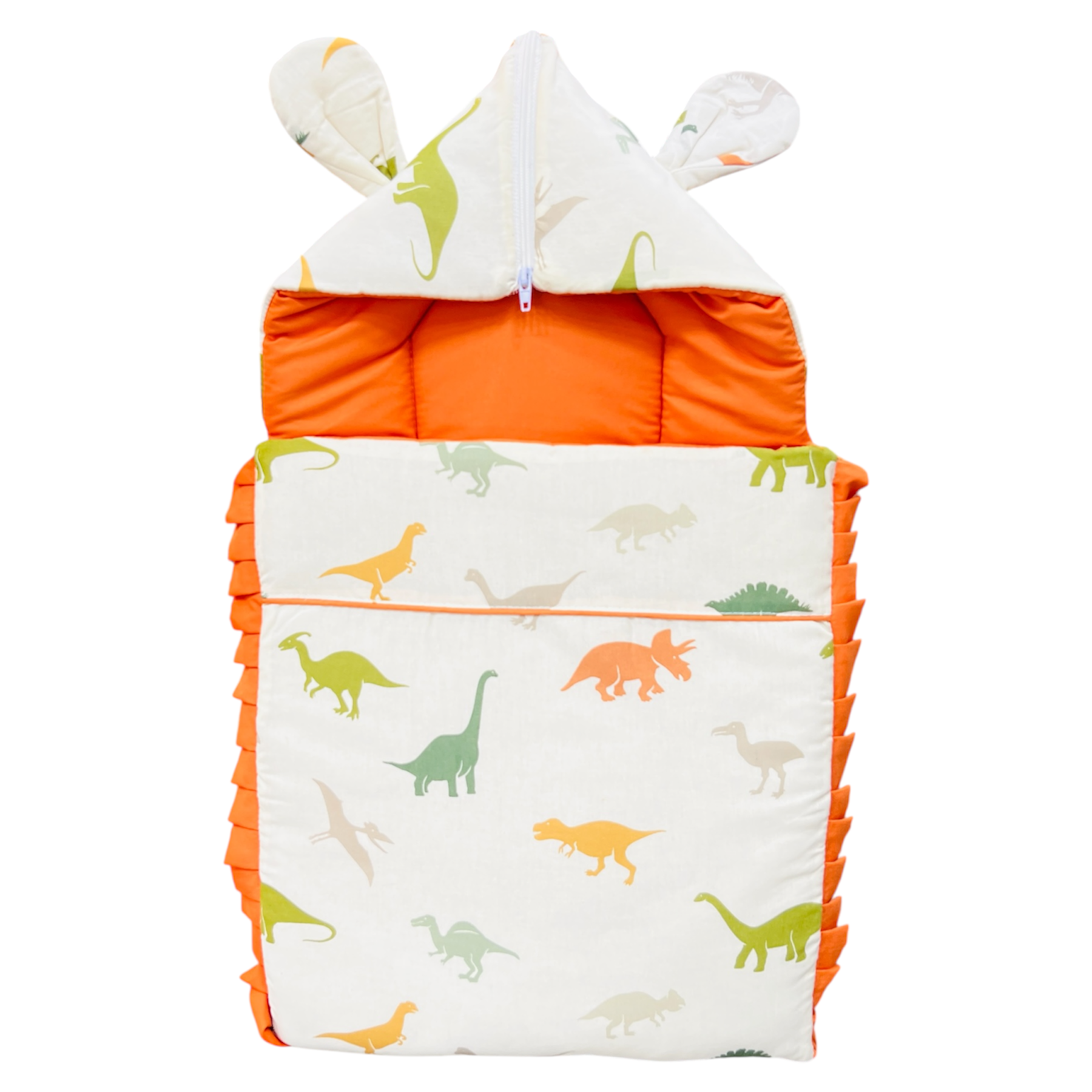 This hooded carry nest is made of soft cotton fabric and features a playful dino theme. Designed with your baby's comfort in mind, it provides a cozy and secure space for them to rest while on the go. With its hood, your little one can also stay protected from the elements. Perfect for busy parents looking for convenience and style.