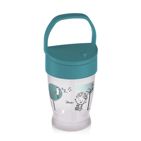 The cup has cap with a comfortable handle, which allows easy closing and opening also for a child. Characteristic click is a sign that the cup is well closed and can be safely held by the child.