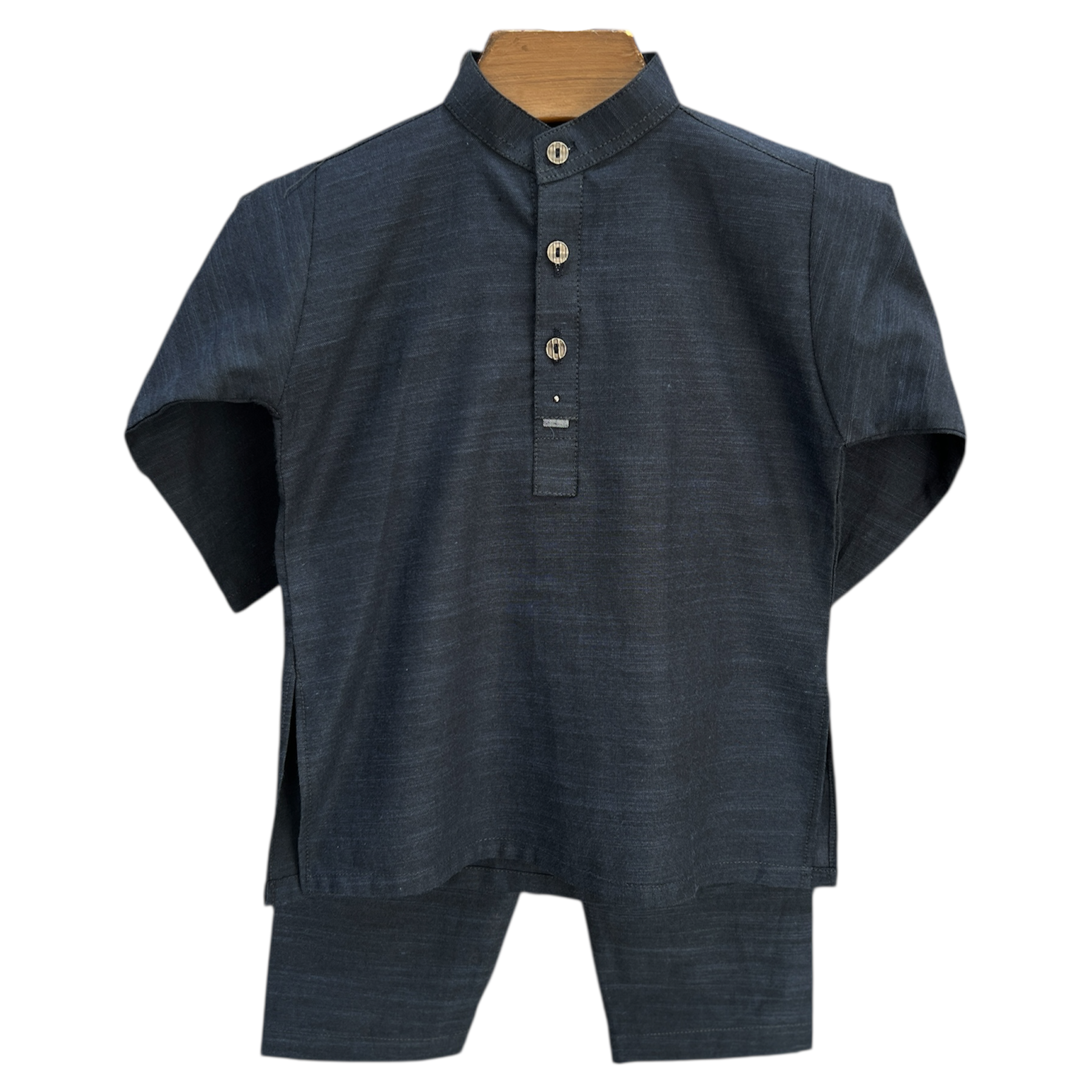 Expertly crafted in a comfortable wash n wear fabric, this navy blue kurta shalwar set is designed to keep your baby boy looking stylish and feeling at ease. Perfect for any occasion, this set offers both durability and comfort for your little one.