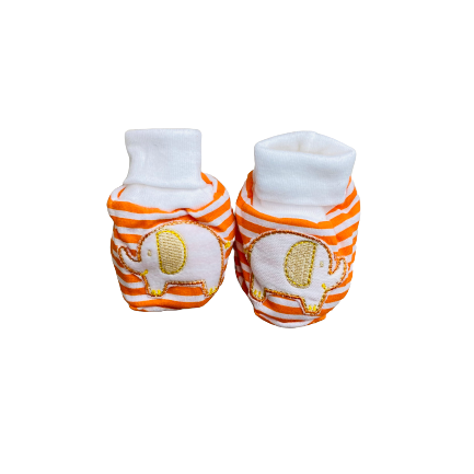 Design: The booties are usually designed with simplicity and practicality in mind. They often feature a slip-on style with an elastic or stretchy opening, making it easy to put them on and take them off. The design ensures a snug and secure fit, so the booties stay in place on the baby's feet.
