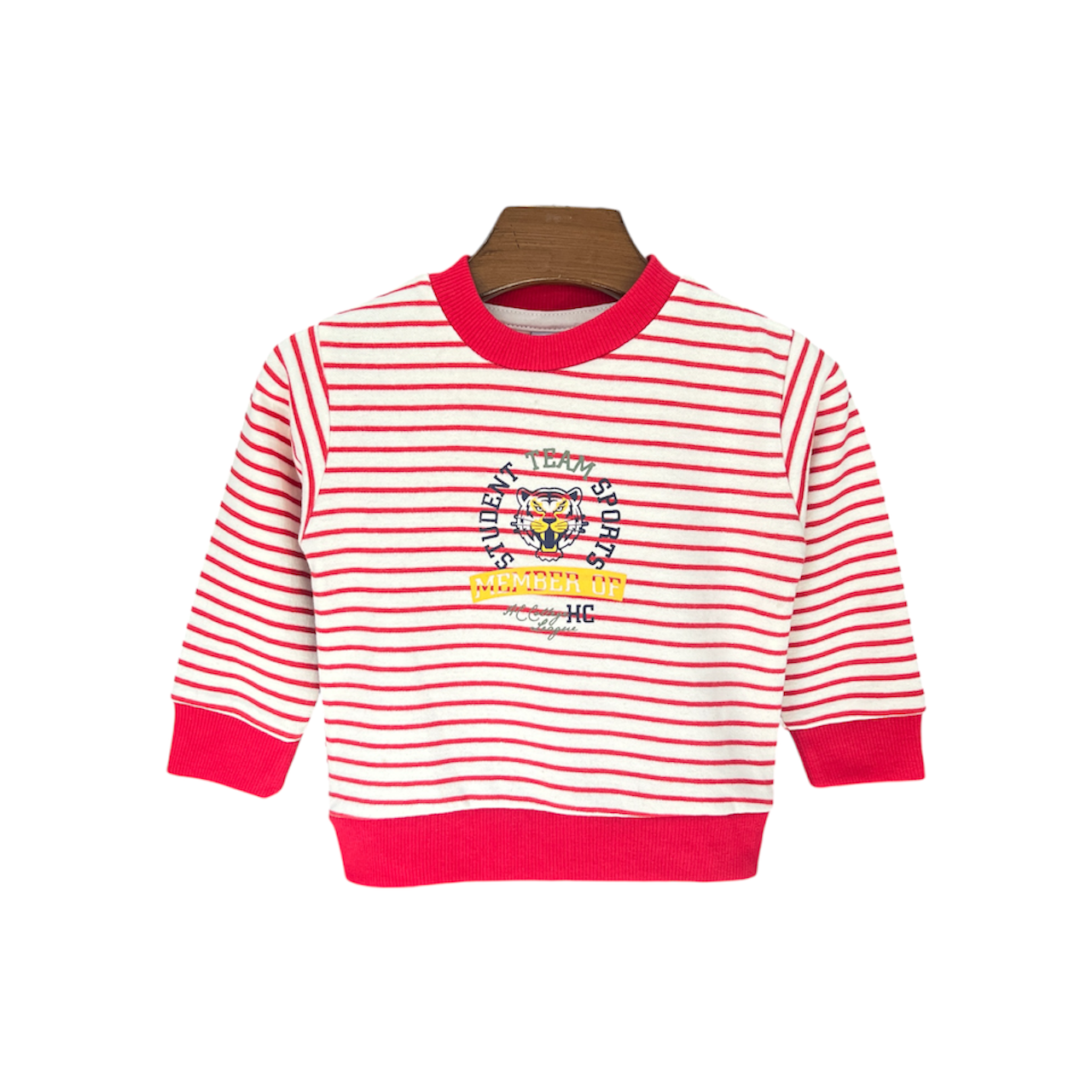 This Red Stripes Full Sleeves T-Shirt offers comfortable, breathable fabric designed specifically for baby boys. Its long sleeves provide added warmth, making it ideal for cooler days while the vibrant red stripes add a playful touch to your child's wardrobe. Easy to put on and gentle on sensitive skin, this T-shirt combines practicality with style for everyday wear.