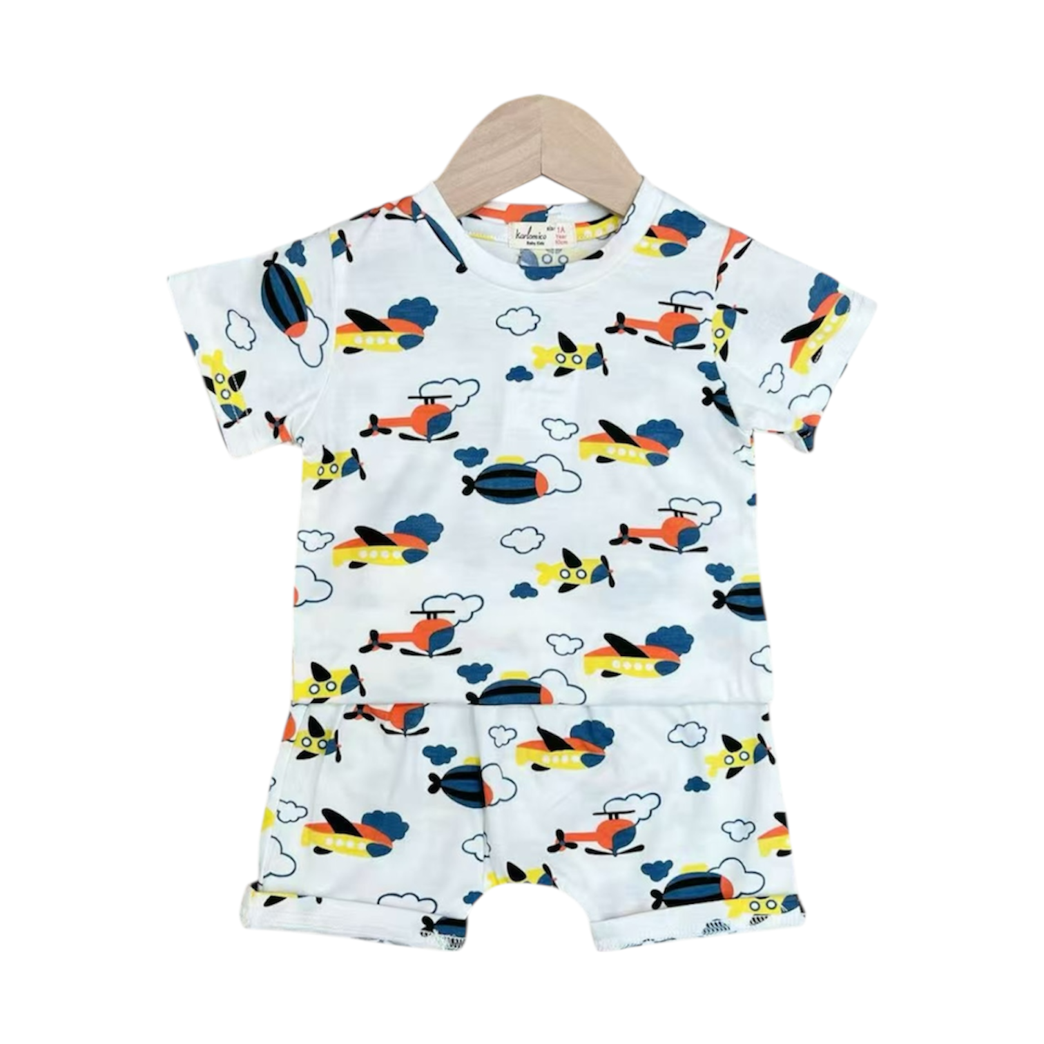 Little aviators will love taking flight in this charming two-piece summer set! Featuring a vibrant helicopter print that sparks imagination, this outfit combines comfort with style for warm-weather adventures. The lightweight fabric keeps your baby boy cool and comfortable all day long, while the playful design makes getting dressed fun. Perfect for playdates, outings, or everyday wear, this set is a must-have addition to any toddler's wardrobe.