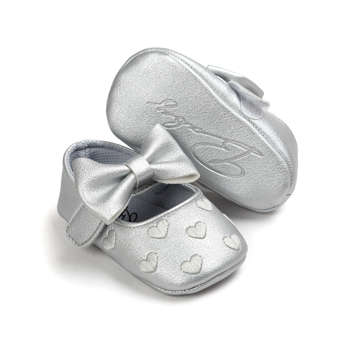 These Silver Heart Pre Walker Pumps are a stylish and practical choice for your little one's first shoes. Made with a soft and flexible sole, these pumps provide comfort and support for those early steps. The silver heart design adds a touch of charm to any outfit.